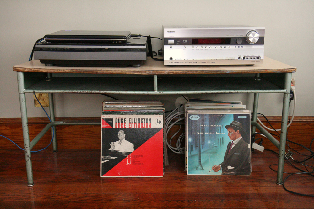 This circa 1964 NY Board of Education desk was found curbside in NYC's Upper West Side. My brother, twenty-some blocks from his apartment, lugged this treasure home on his back. It eventually made its way to Massachusetts where we have finally decided to use it as our entertainment perch. (It would also make a great coffee table....)